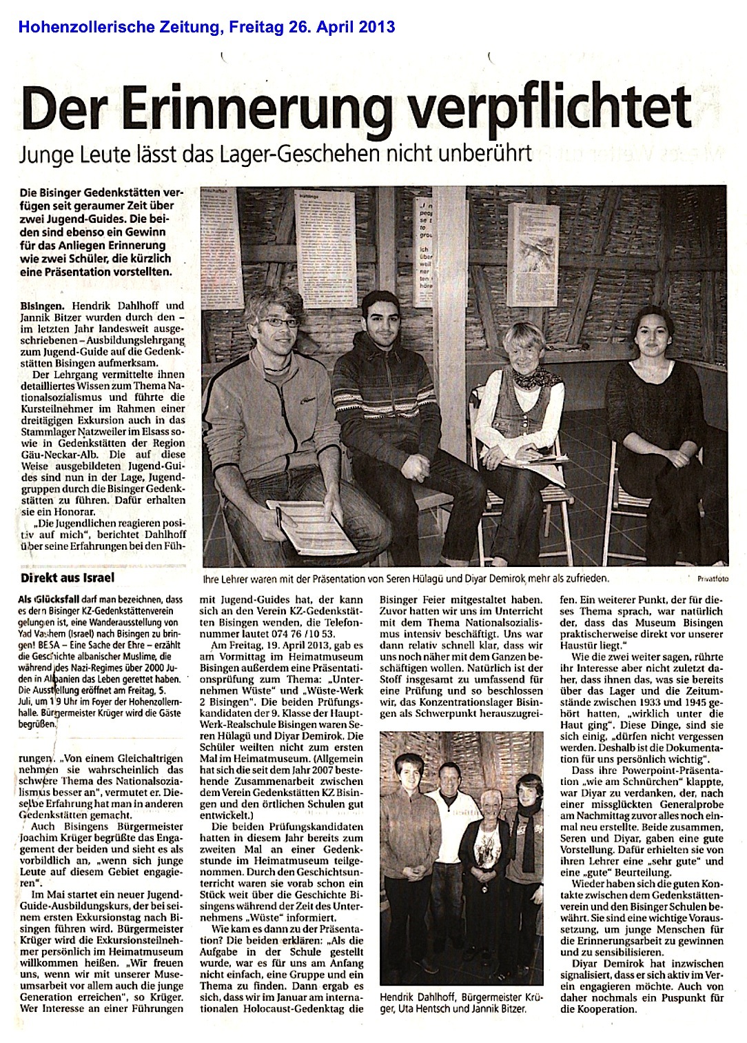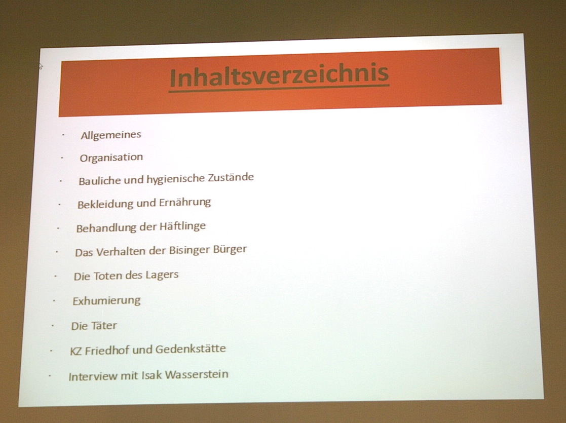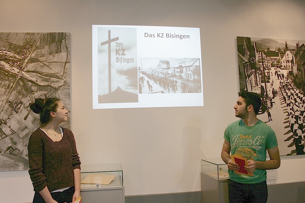 Zum besseren Verständnis: seit Begin 2007 Jahren hat sich die Zusammenarbeit zwischen dem Verein “Gedenkstätten KZ Bisingen” und den Bisinger Schulen außerordentlich gut entwickelt. So konnte u. a. unser Verein in diesem Jahr bereits zum siebenten Mal mit der  Real-  und HWerk-Realschule eine Gedenkstunde zum “Internationalen Holocaust-Gedenktag”  halten, an der jeweils auch die Schüler aktiv eingebunden sind.   Die beiden Prüfungskandidaten hatten in diesem Jahr zum zweiten Mal an der Gedenkstunde im Heimatmuseum teilgenommen (siehe dazu Eintrag vom Januar 2013).  Durch den Geschichtsunterricht waren sie schon ein Stück weit über die Geschichte Bisingens während der Zeit den Unternehmen “Wüste” informiert – die Vorbereitungen für die jeweilige Gedenkstunde unterstützten das Gehörte. Im Folgenden ein kleiner Vorspann von Seren und Diyar zu ihrer Präsentation:
