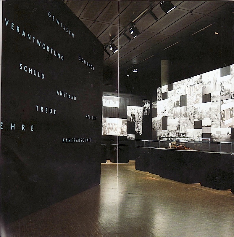 (←Bild aus dem Flyer!) Die großen Bildtafeln an den hohen Wänden zeigten Bilder verschiedener Zeiten an verschiedenen Orten mit verschiedenen Personen – hier hätte man sich namentliche und zeitliche schriftliche Hinweise (Namen von Orten, Personen und entsprechendes Datum) gewünscht. Geht man allein durch die Ausstellung bleiben die Inhalte der riesigen Bildwände dem Betrachter leider „verschlossen“!