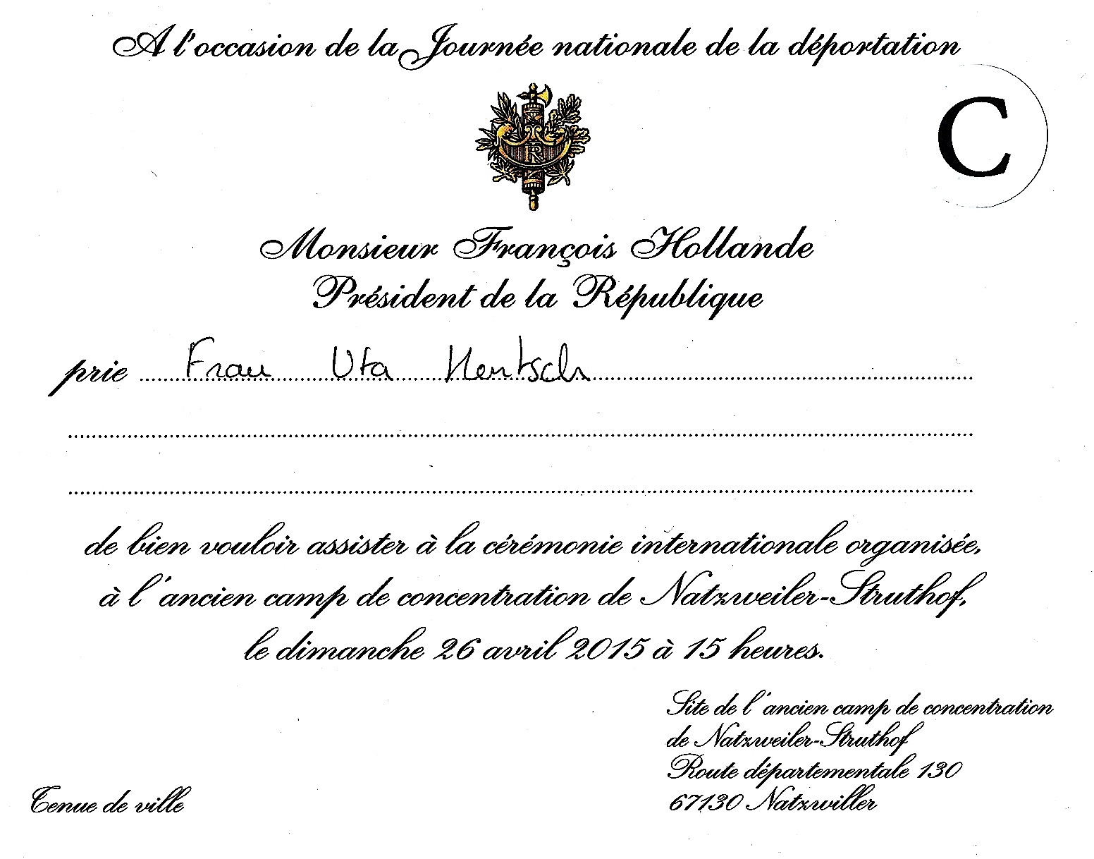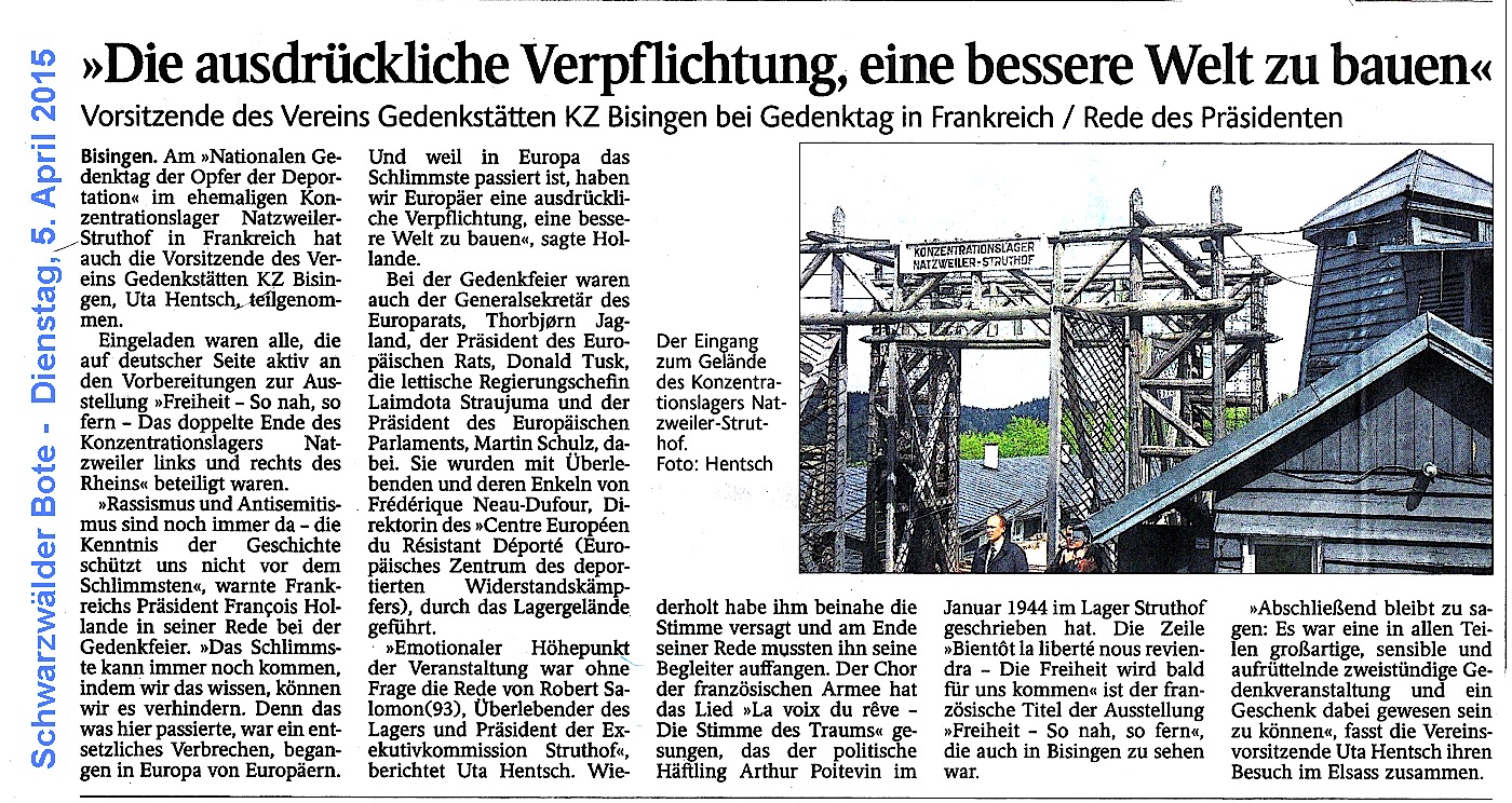 Zum „Nationalen Tag der Deportation“, an dem der Millionen Deportierten während des Zweiten Weltkriegs erinnert wird, hatte die Vorsitzende der Gedenkstätten KZ Bisingen e.V., wie alle auf deutscher Seite aktiv Beteiligten an den Vorbereitungen zur Ausstellung „Freiheit – SO NAH, SO FERN – Das doppelte Ende des Konzentrationslagers Natzweiler links und rechts des Rheins“, für Sonntag, 26. April 2015 nach Natzweiler–Struthof eine Einladung erhalten.