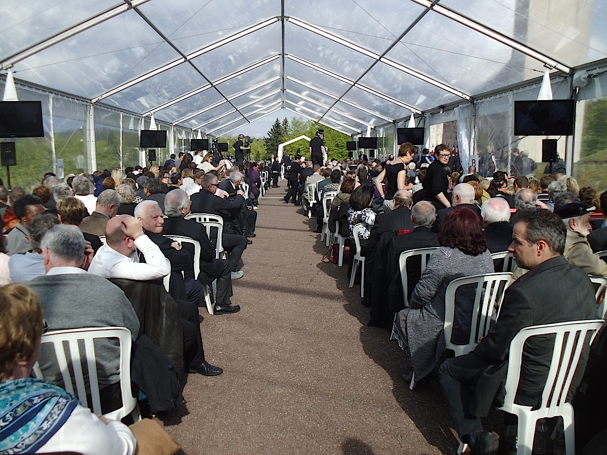 Die Empfangszeremonien und einzelnen Programmpunkte insgesamt aufzuzählen ist hier nicht möglich. Bevor Präsident Francois Hollande mit den anwesenden EU-Politikern, Überlebenden und Enkeln Überlebender, von Frederique Neau-Dufour, Direktorin der CERD – Centre Européen du Résistant Déporté (Europäisches Zentrum der deportierten Widerstandskämpfer, durch das Lagergelände geführt wurden, soll doch ein Programmpunkt besondere Aufmerksamkeit erhalten,
