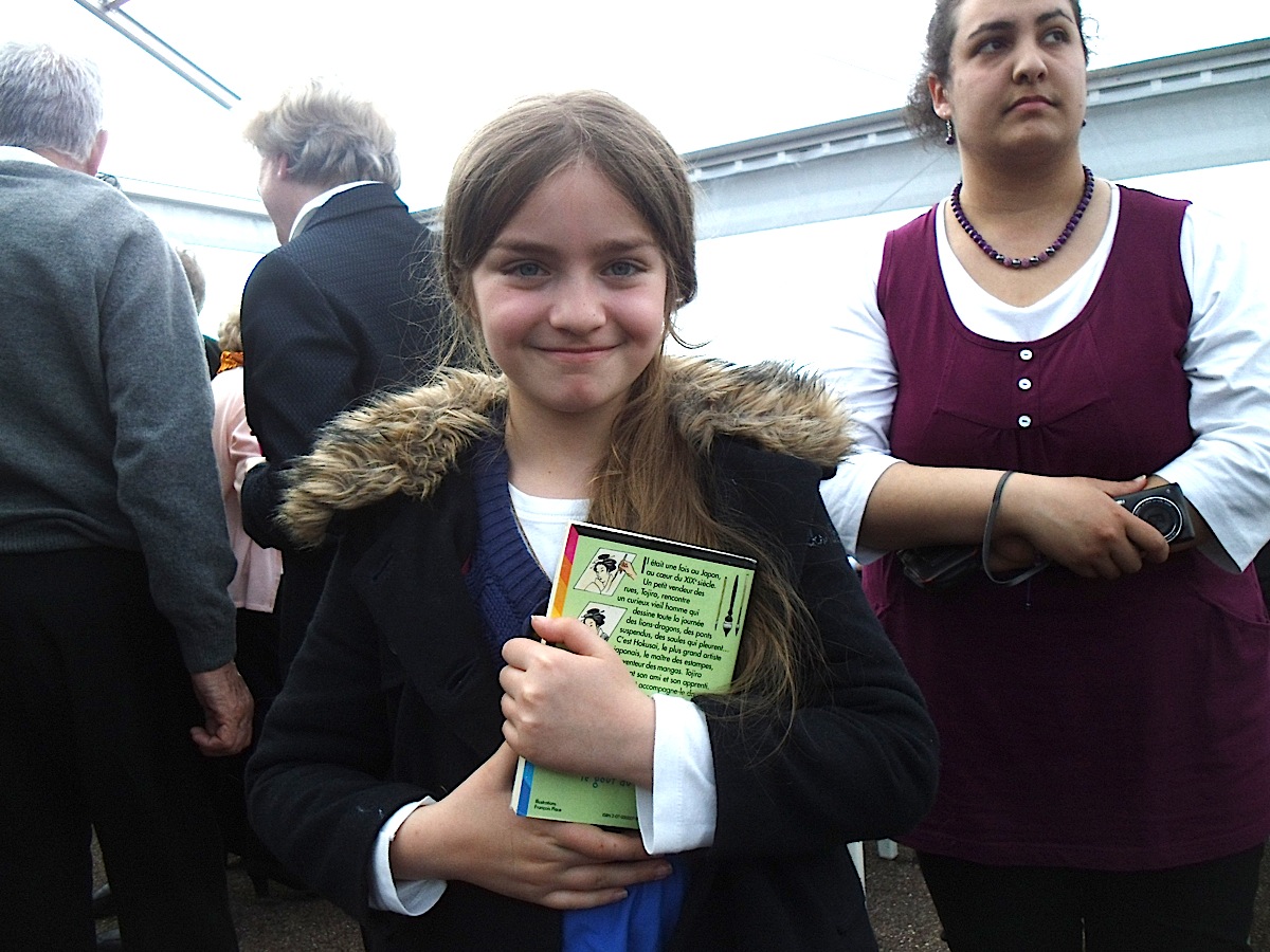 der sehr kurzfristig noch mit aufgenommen wurde: ein Lied, vorgetragen von der 8jährigen Tosca, zur Gruppe Überlebender Szinti und Roma gehörend. Schon allein ihre wunderschöne reine Kinderstimme bewirkte viele aufsteigende Tränen bei uns Zuhörenden.
