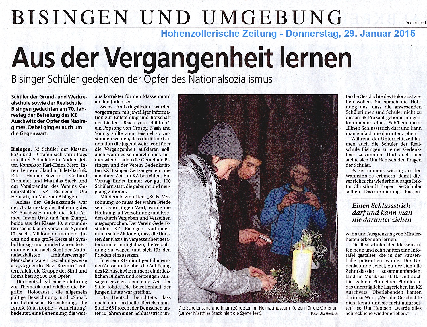 An dieser Stelle möchten wir dem mit Ende des Schuljahrs 2014/2015 ausgeschiedenen Rektor der Realschule Bisingen, Christhard Tröger, für die gute Zusammenarbeit mit dem Verein „Gedenkstätten KZ Bisingen“ danken. Eine jährliche Veranstaltung zum 27. Januar und die alljährlich wiederkehrende „Säuberungsaktion“ auf dem Geschichtslehrpfad in der letzten Woche vor den Sommerferien sind zu festen Einrichtungen geworden. Es ist gut zu wissen, dass diese gute Zusammenarbeit auch künftig weitergehen wird. – Uta Hentsch