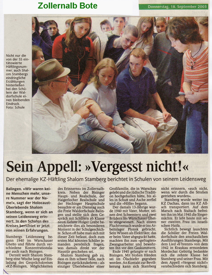 An dieser Stelle möchten wir dem mit Ende des Schuljahrs 2014/2015 ausgeschiedenen Rektor der Realschule Bisingen, Christhard Tröger, für die gute Zusammenarbeit mit dem Verein „Gedenkstätten KZ Bisingen“ danken. Eine jährliche Veranstaltung zum 27. Januar und die alljährlich wiederkehrende „Säuberungsaktion“ auf dem Geschichtslehrpfad in der letzten Woche vor den Sommerferien sind zu festen Einrichtungen geworden. Es ist gut zu wissen, dass diese gute Zusammenarbeit auch künftig weitergehen wird. – Uta Hentsch